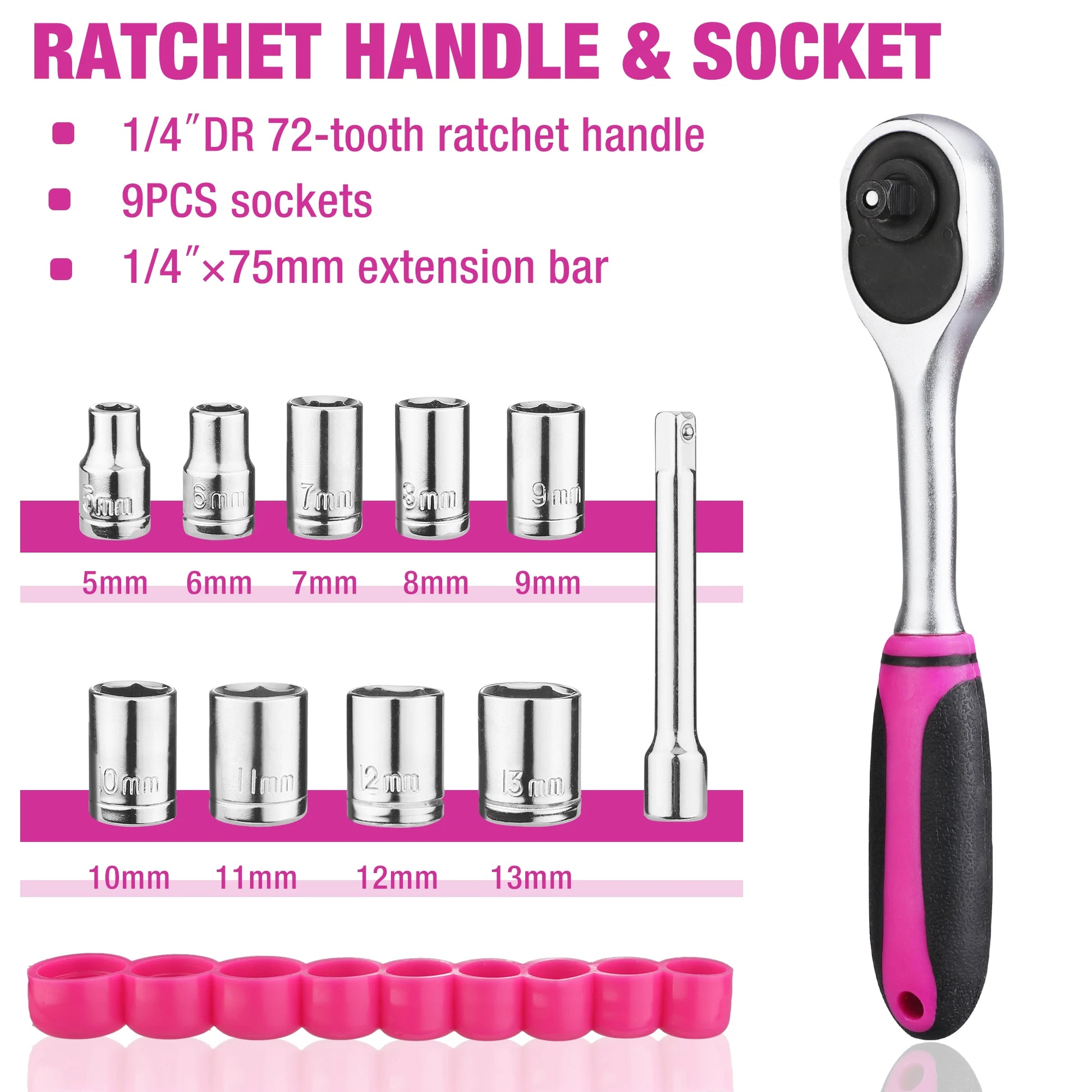 Juego de herramientas rosa para el hogar de 218 piezas con bolsa de apertura grande de 13"