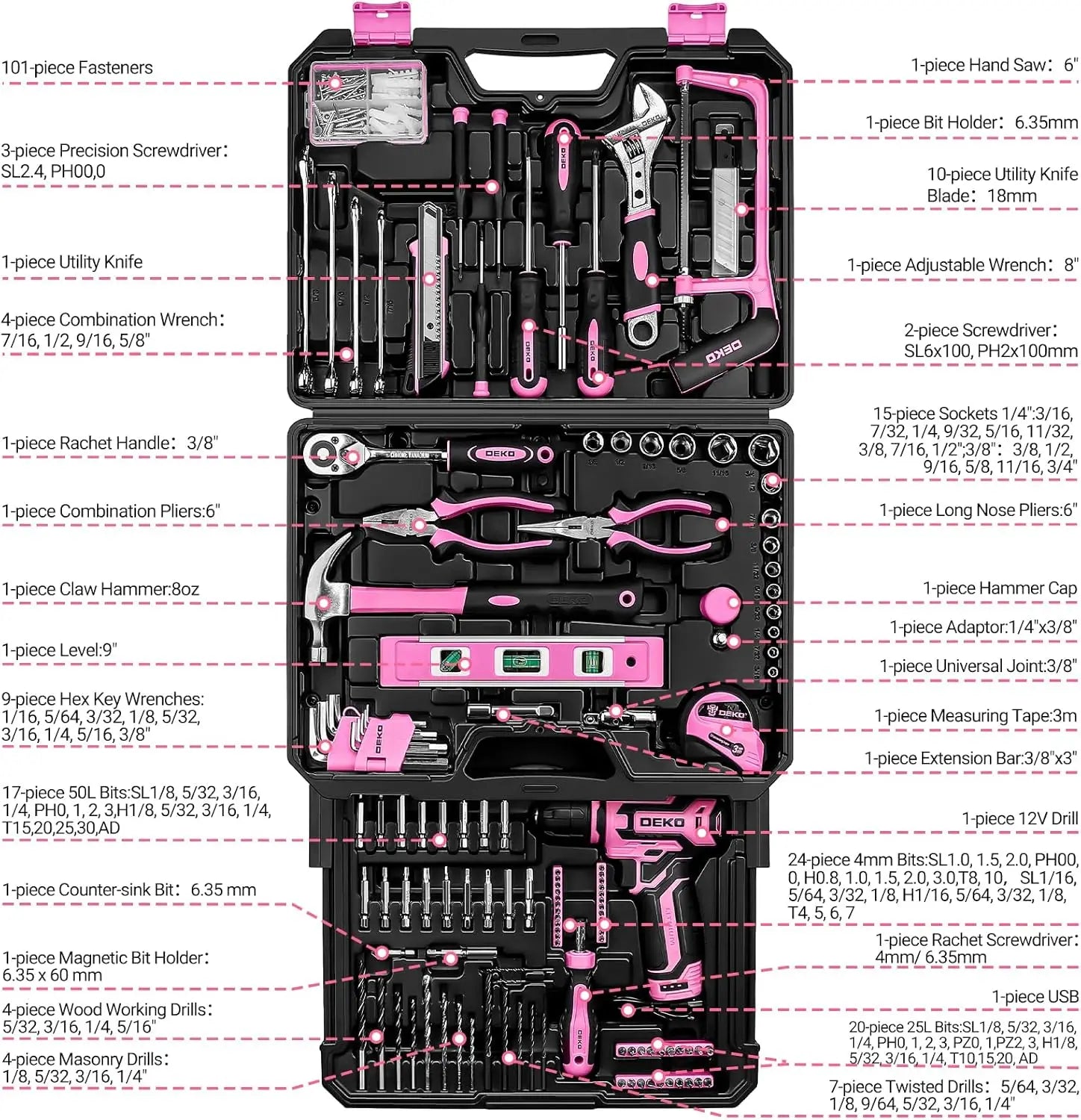 Juego de herramientas rosa 238 piezas con taladro inalámbrico 12V y caja organizadora
