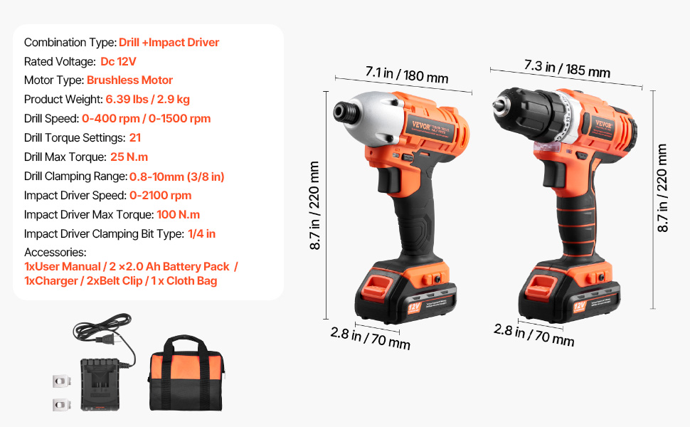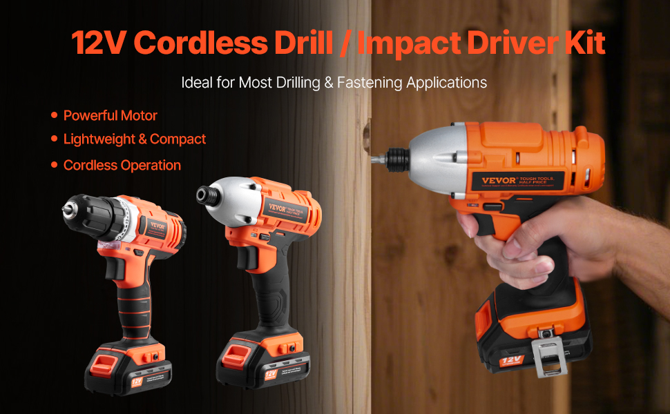Kit de Taladro Inalámbrico y Atornillador de Impacto 12V con Baterías de 2.0Ah y Cargador
