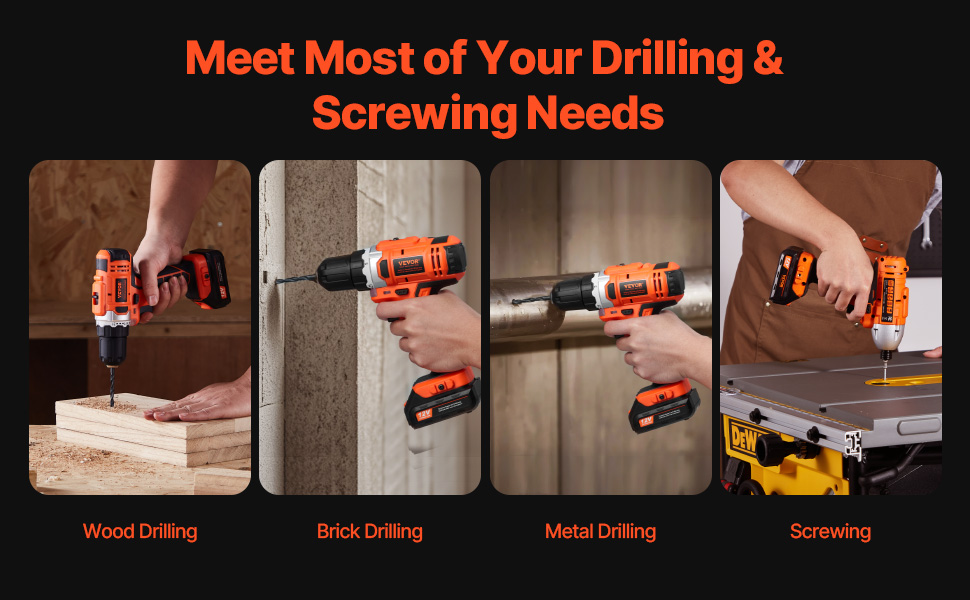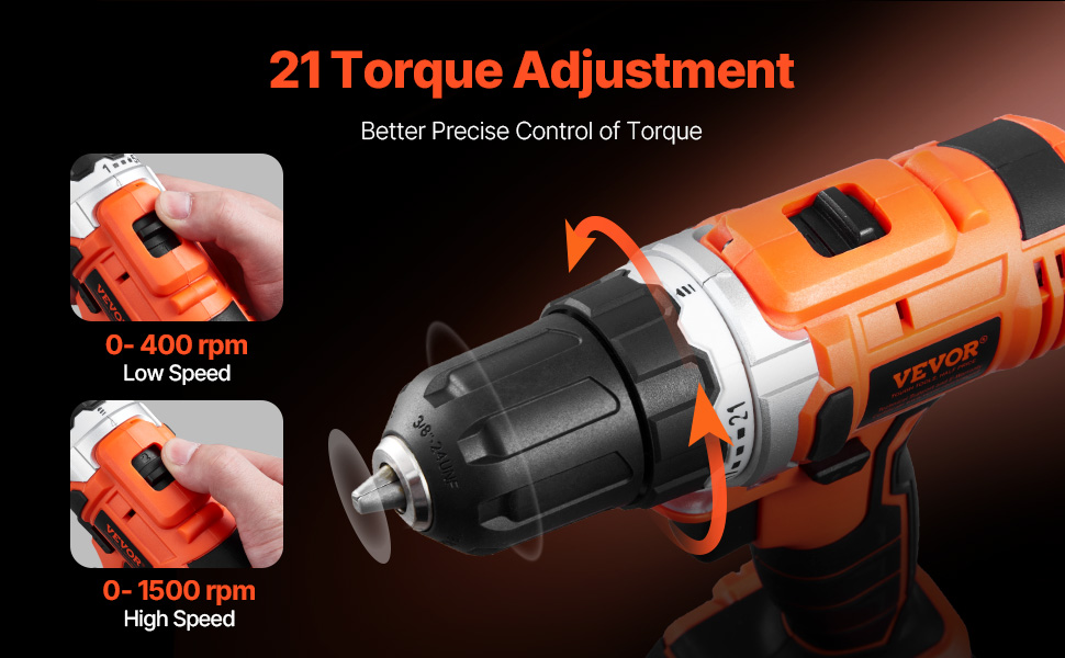 Taladro de alto rendimiento: Torque máximo de 25 N·m con 21 niveles de ajuste y 2 velocidades (0–400 RPM y 0–1500 RPM) para un control preciso en diferentes materiales.