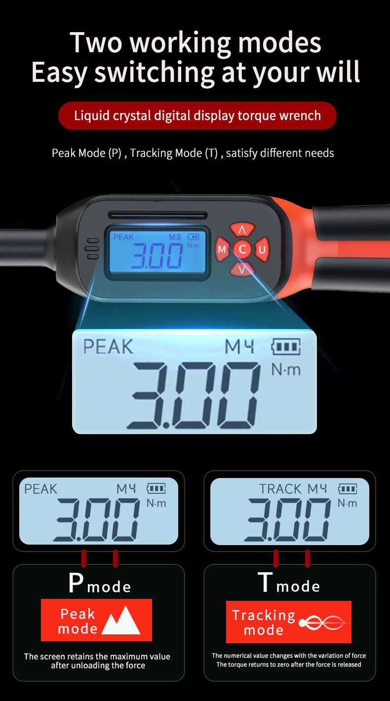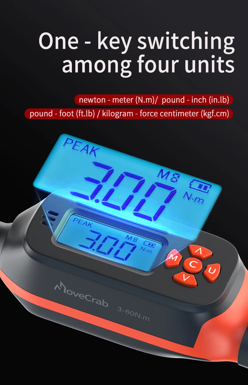 Versatilidad en la medición: Selección rápida entre 4 unidades de medida (N·m, in·lb, ft·lb, kgf·cm). Incluye modos de seguimiento y pico, además de memoria para 10 valores preconfigurados.