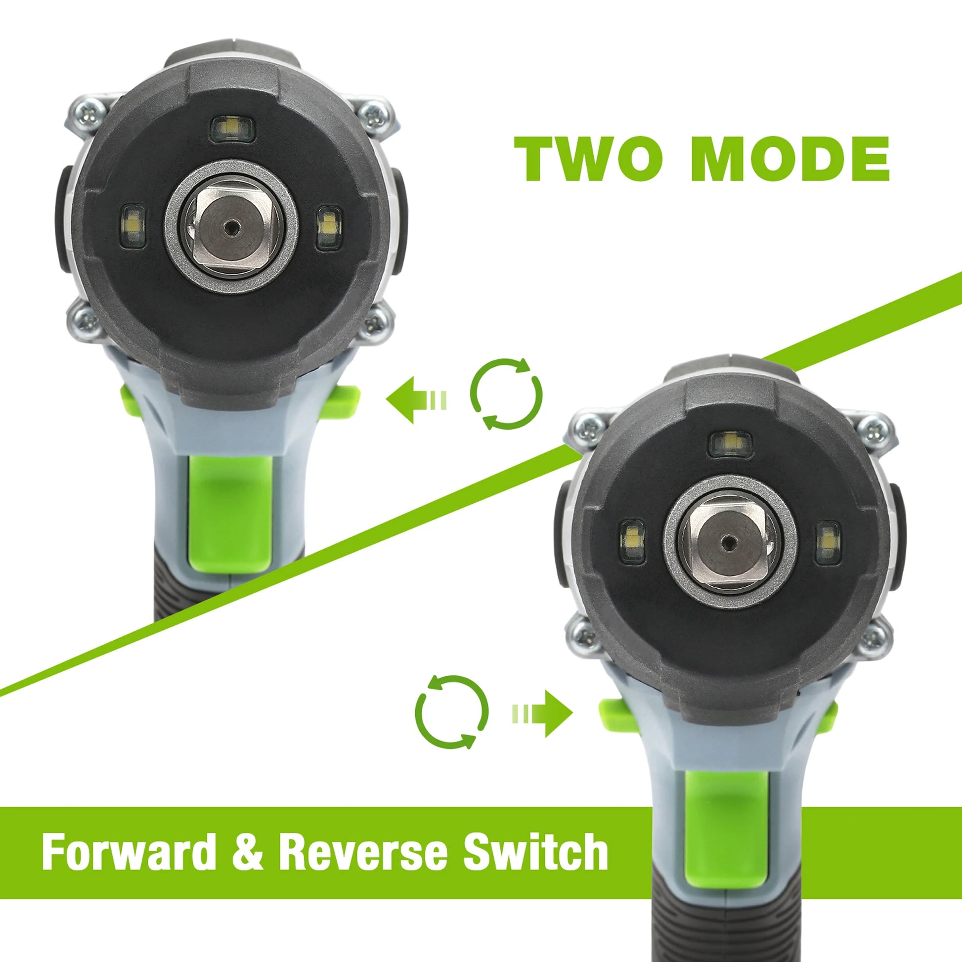 Modos de uso: Interruptor de cambio para seleccionar entre giro hacia adelante y hacia atrás, ofreciendo versatilidad en cualquier tarea.