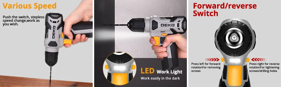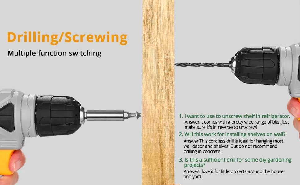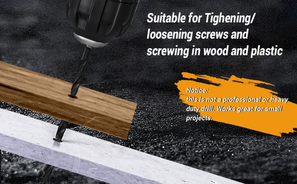 Perforación y atornillado eficiente: Este taladro eléctrico inalámbrico de 8 V es ideal para trabajos en madera y plástico (no apto para mampostería o concreto). También sirve para apretar o aflojar tornillos. Incorpora una luz LED que mejora la visibilidad en espacios oscuros, perfecto para proyectos de bricolaje y mantenimiento en el hogar.